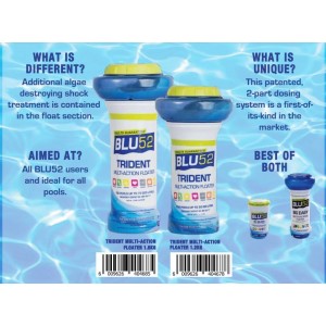 Trident?s stabilized floater delivers powerful, long-lasting sanitation with Tri-Chlor (90 persent available chlorine) for crystal-clear water. Its innovative 2-part dosing system makes maintenance effortless: Unscrew the lid and pour the contents into the weir. Re-fit the lid and place the floater directly into the pool. Enjoy consistent, reliable chlorine release with a simple, convenient design that is perfect for small to medium pools.